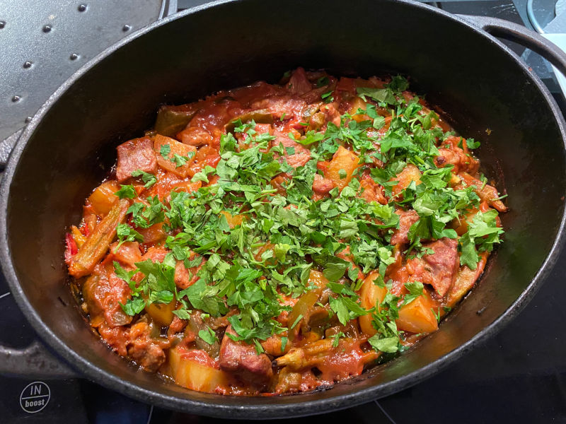 Das Gemüse 15 Minuten bei 230 Grad im Ofen anbraten (Tontopf oder Bräter). Dann das Fleisch und die Kartoffeln dazugeben, würzen und nochmal 10 Minuten im Ofen braten. Dann das Gövetsch (eingelgte Gemüse) dazugeben und evtl. mit Wasser auffüllen, bis alles bedeckt ist. Weitere 50 Minuten bei 160 Grad braten. Das Fleisch sollte sehr weich sein.